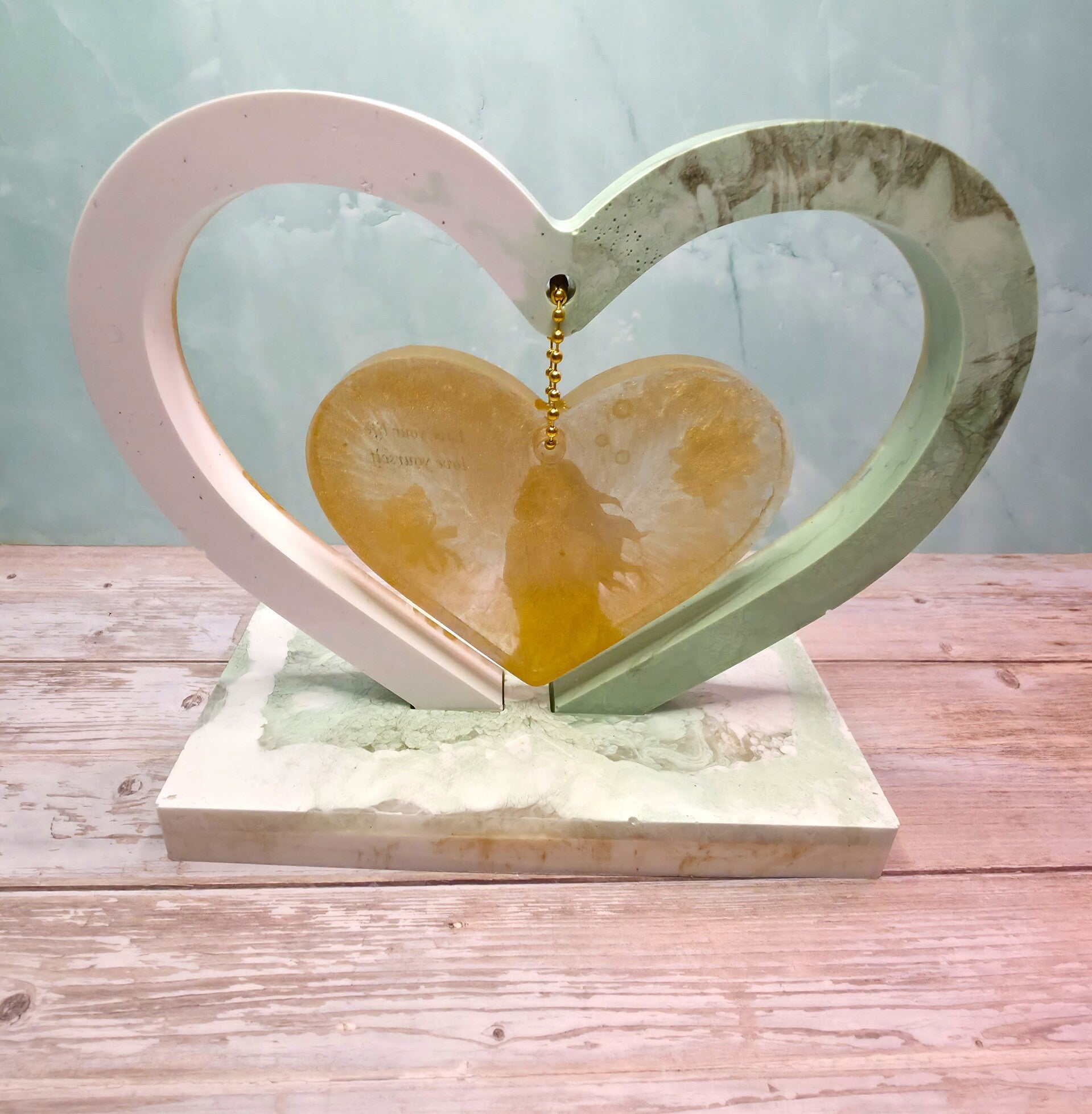 Diese handgefertigte Herz-Dekoration aus Epoxidharz ist ein ganz besonderes Highlight: Ein zartes Herz schwebt im Inneren eines größeren Rahmens und wird so zum Symbol für Verbundenheit, Erinnerung und Liebe.